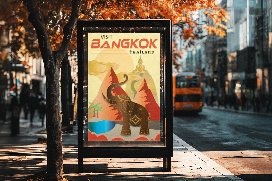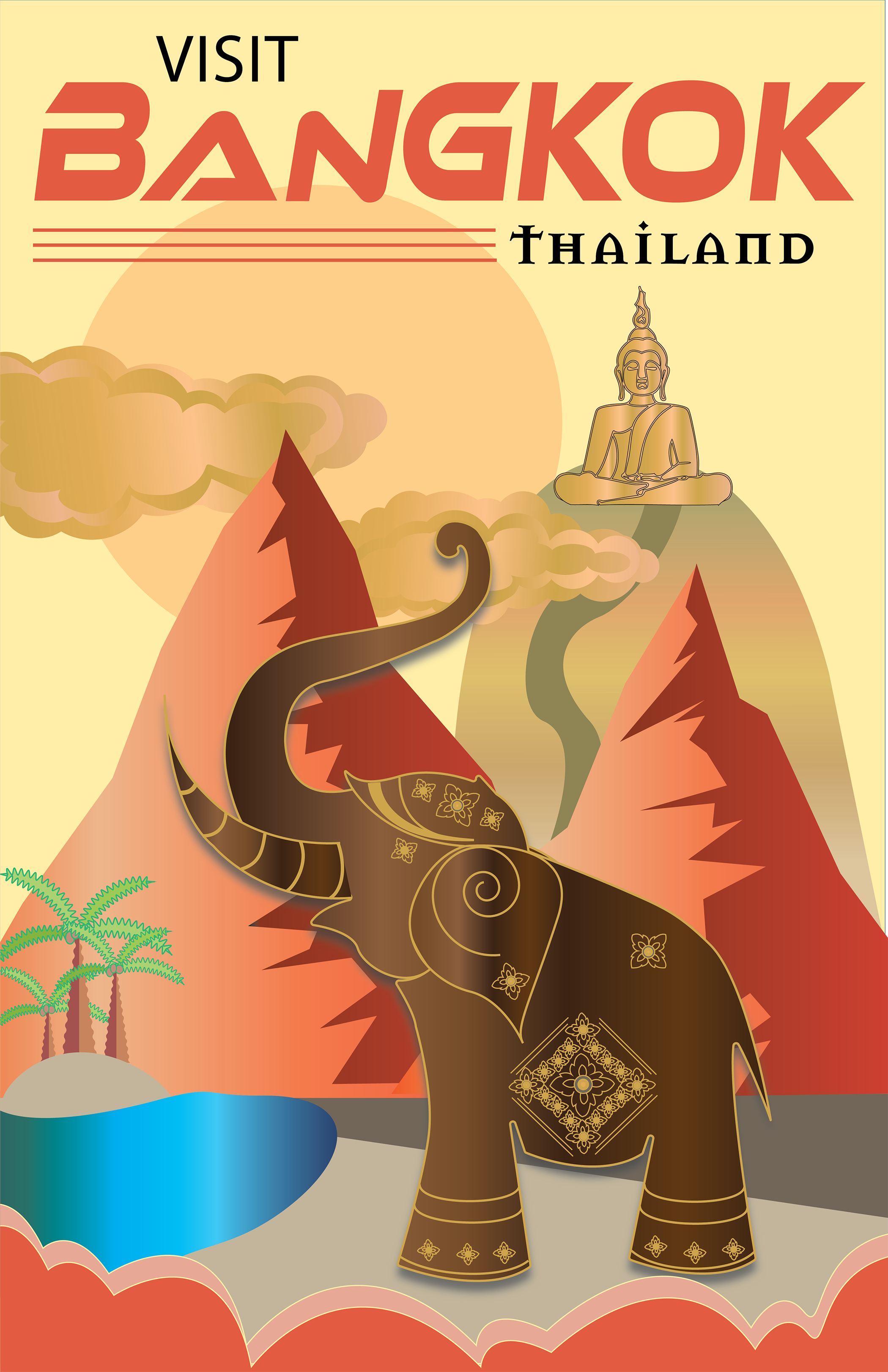 I had a lot of fun creating the cloud shapes, elephant and mountain elements of this Thailand travel poster.