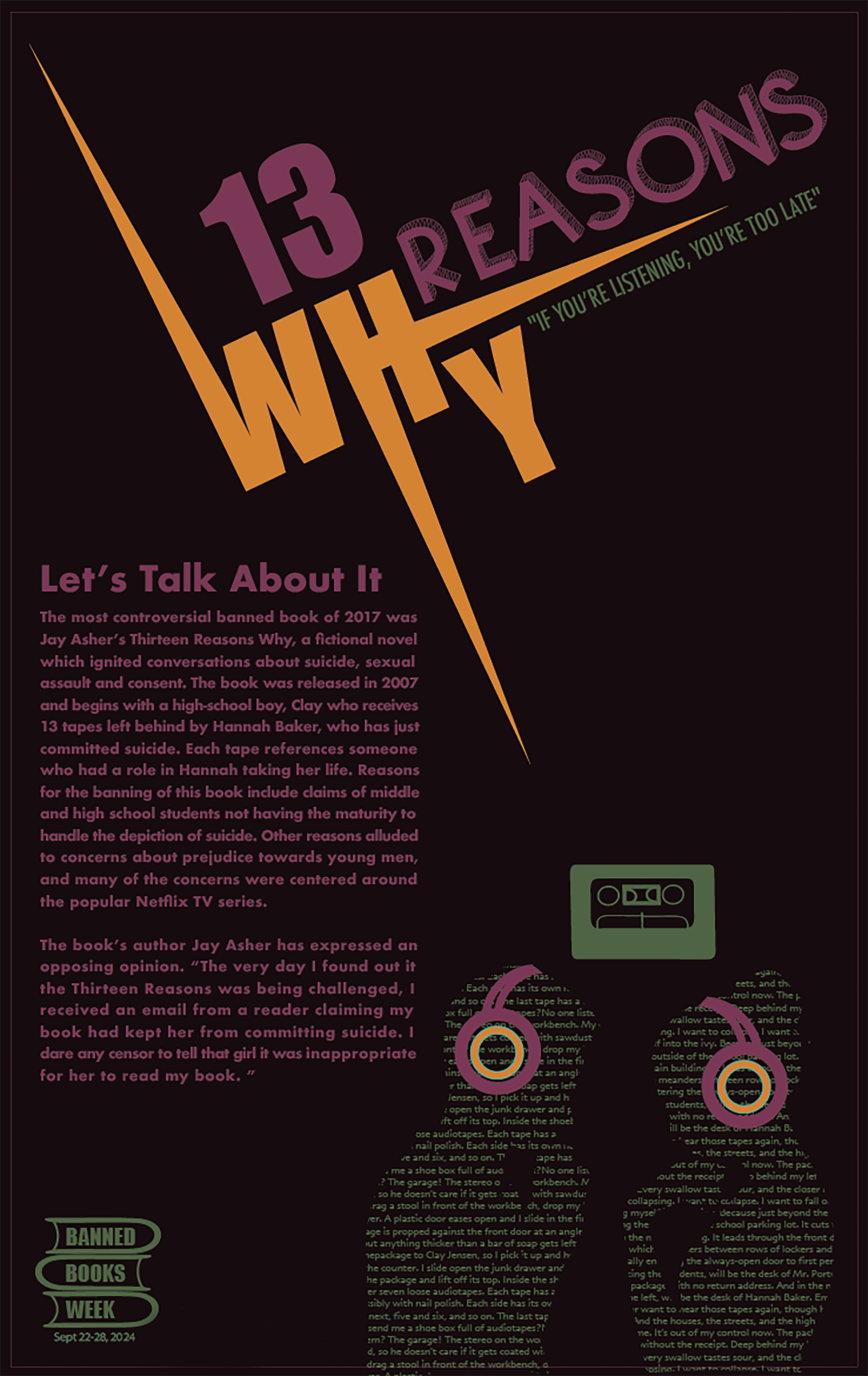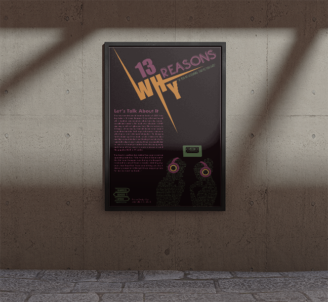 For this banned books poster for “13 Reasons Why”, I wanted to make an impactful typographic statement. I also wanted to give a nod to the fans by creating the type figures with headphones. I designed the entire poster, including the Banned Books logo, and wrote the copy.