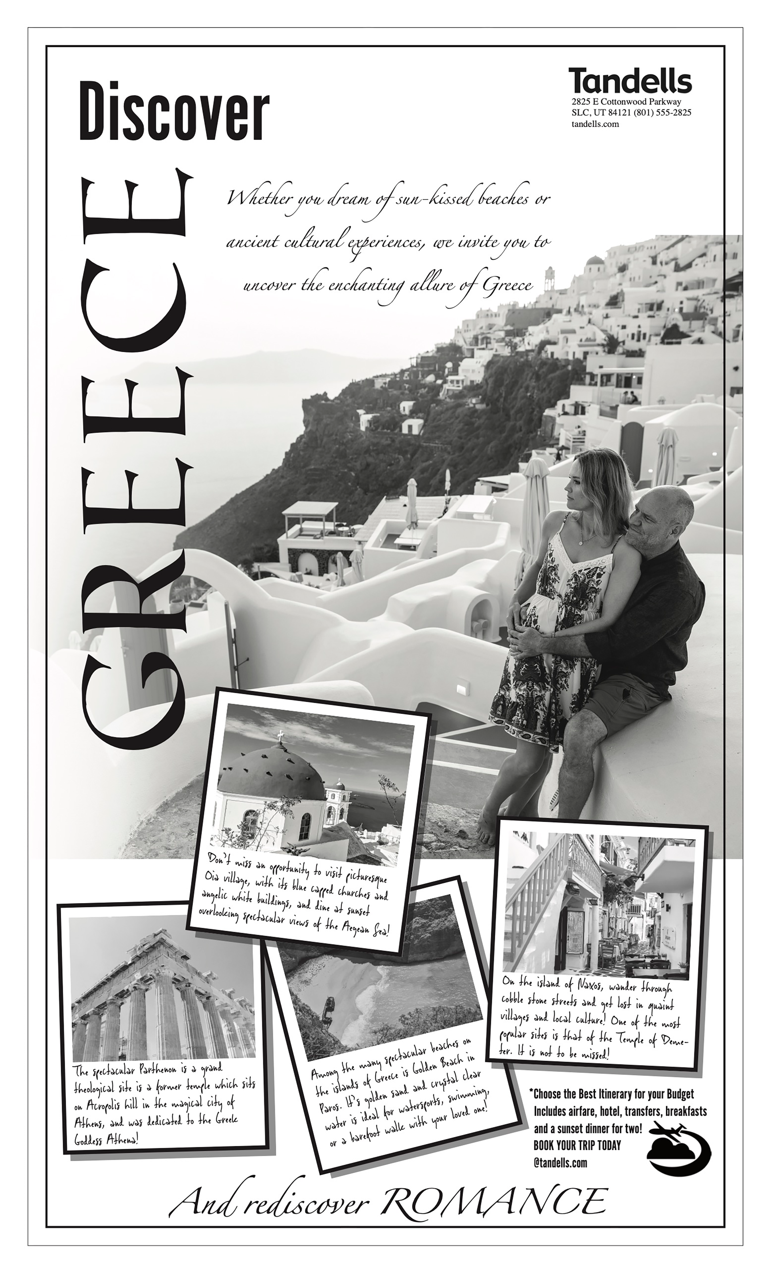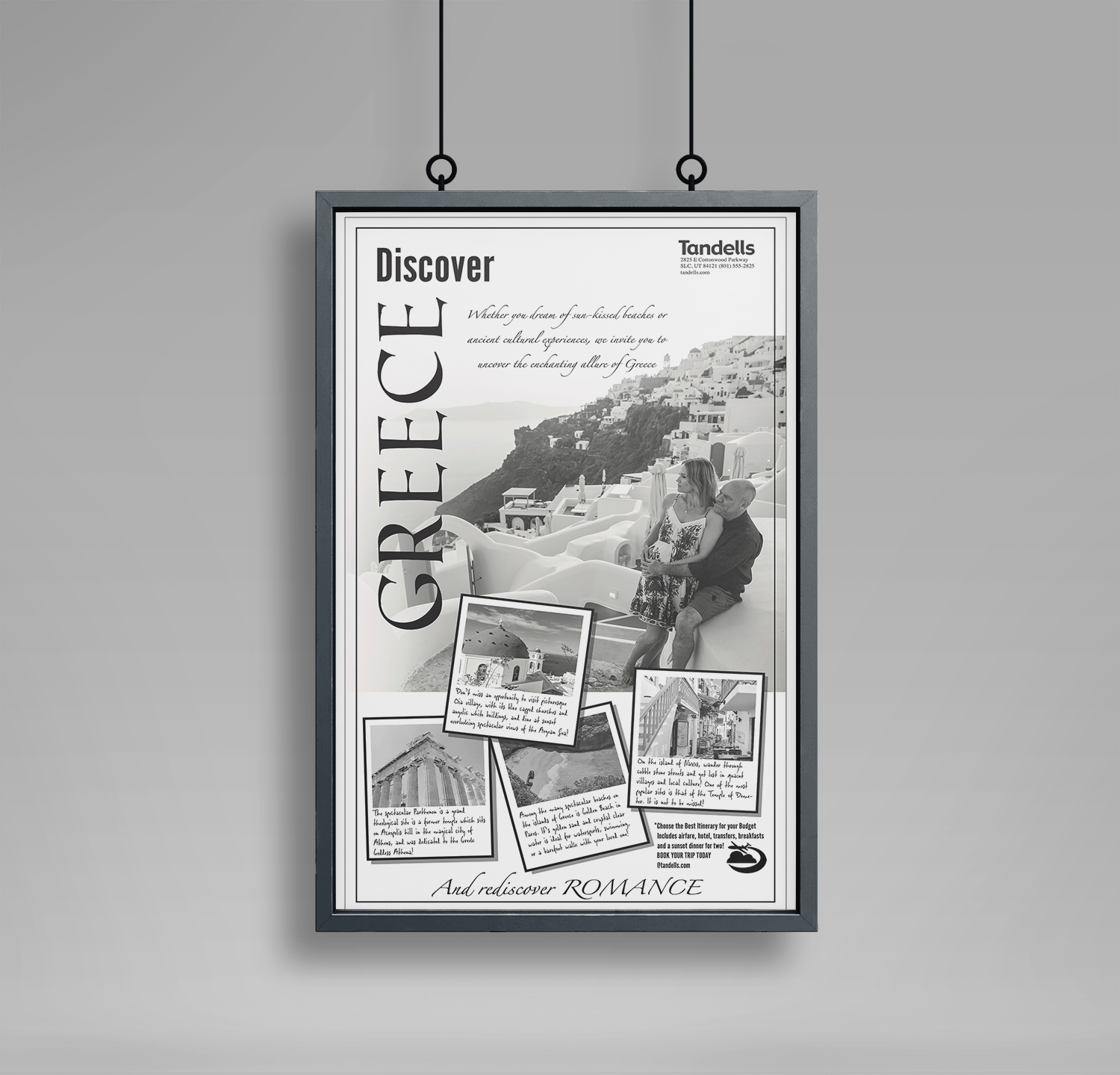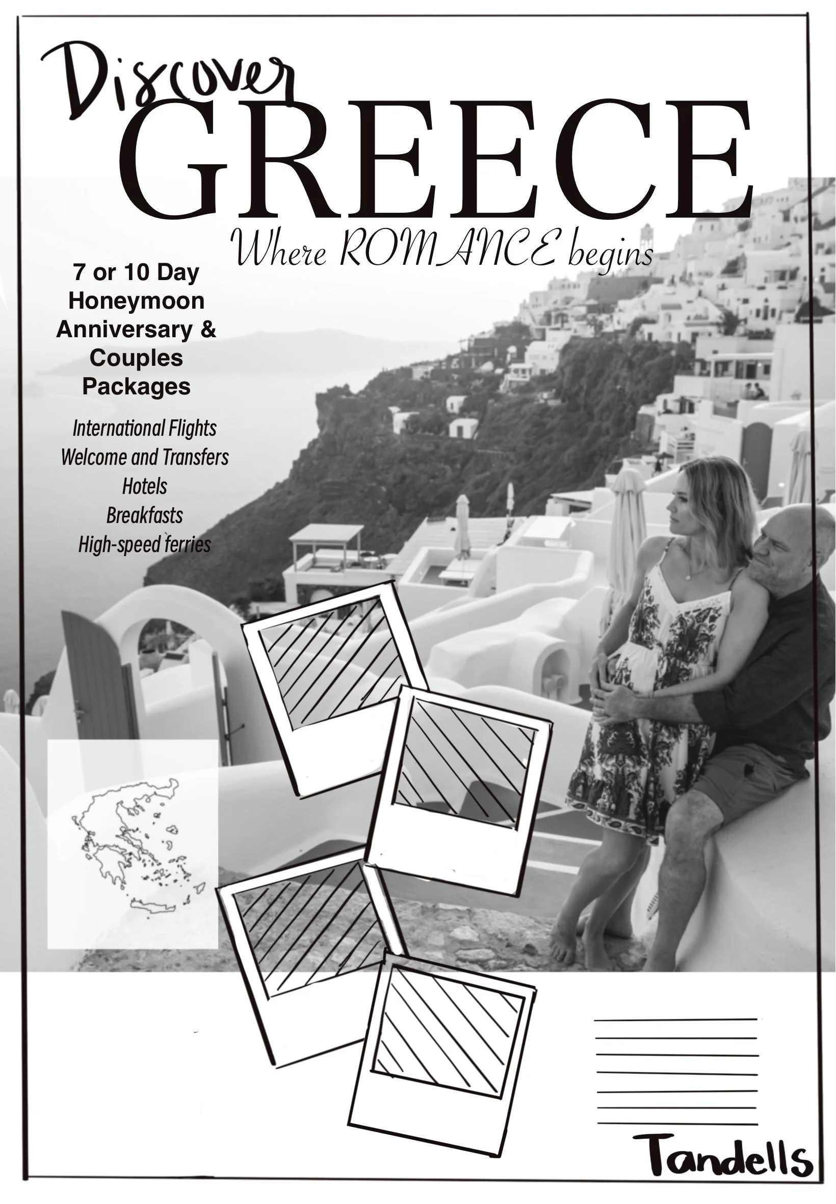 For this travel advertisement, I wanted the layout to feel like a postcard, something that draws you into the scenery. This romantic Greece photograph was the perfect backdrop.