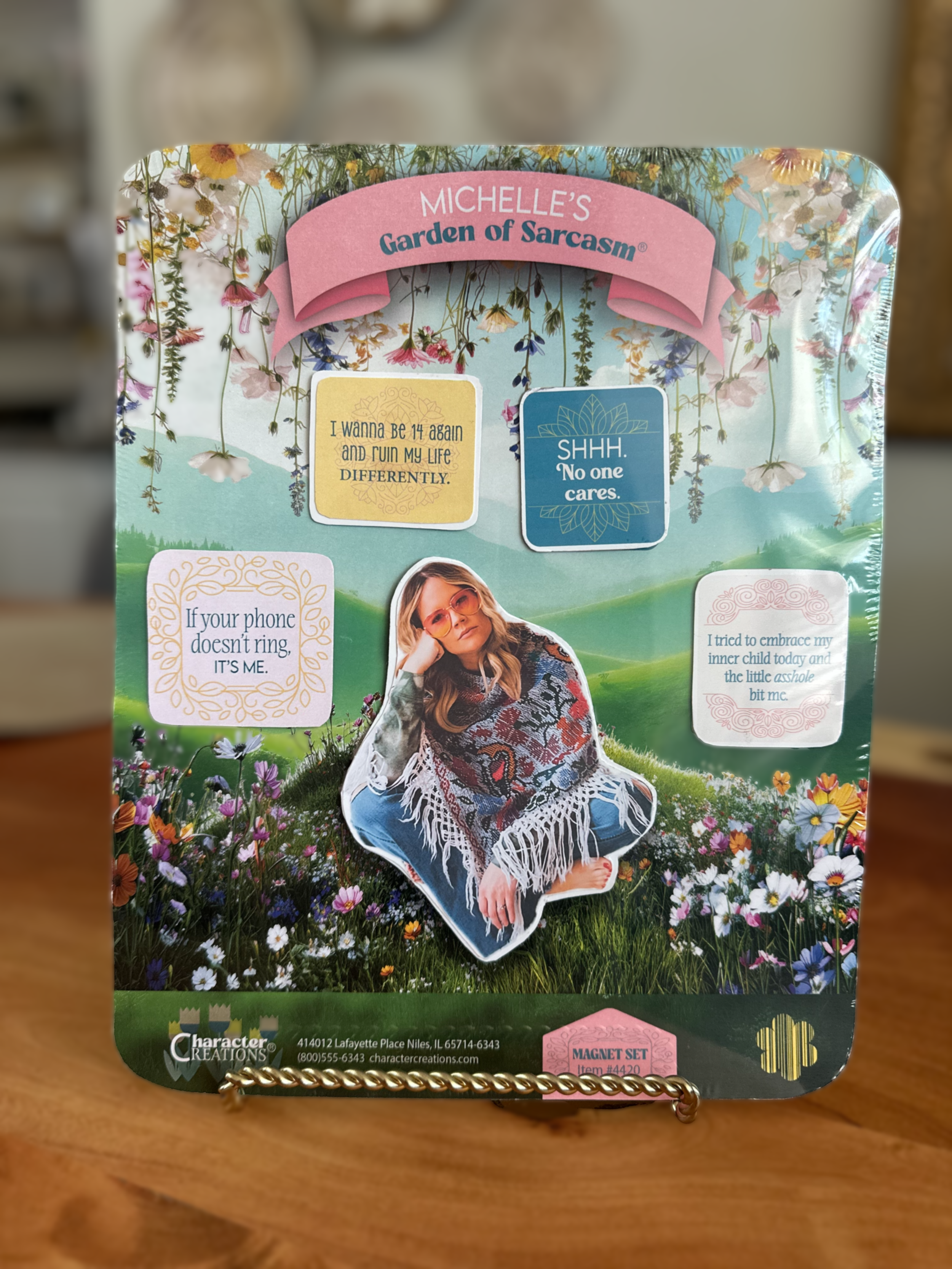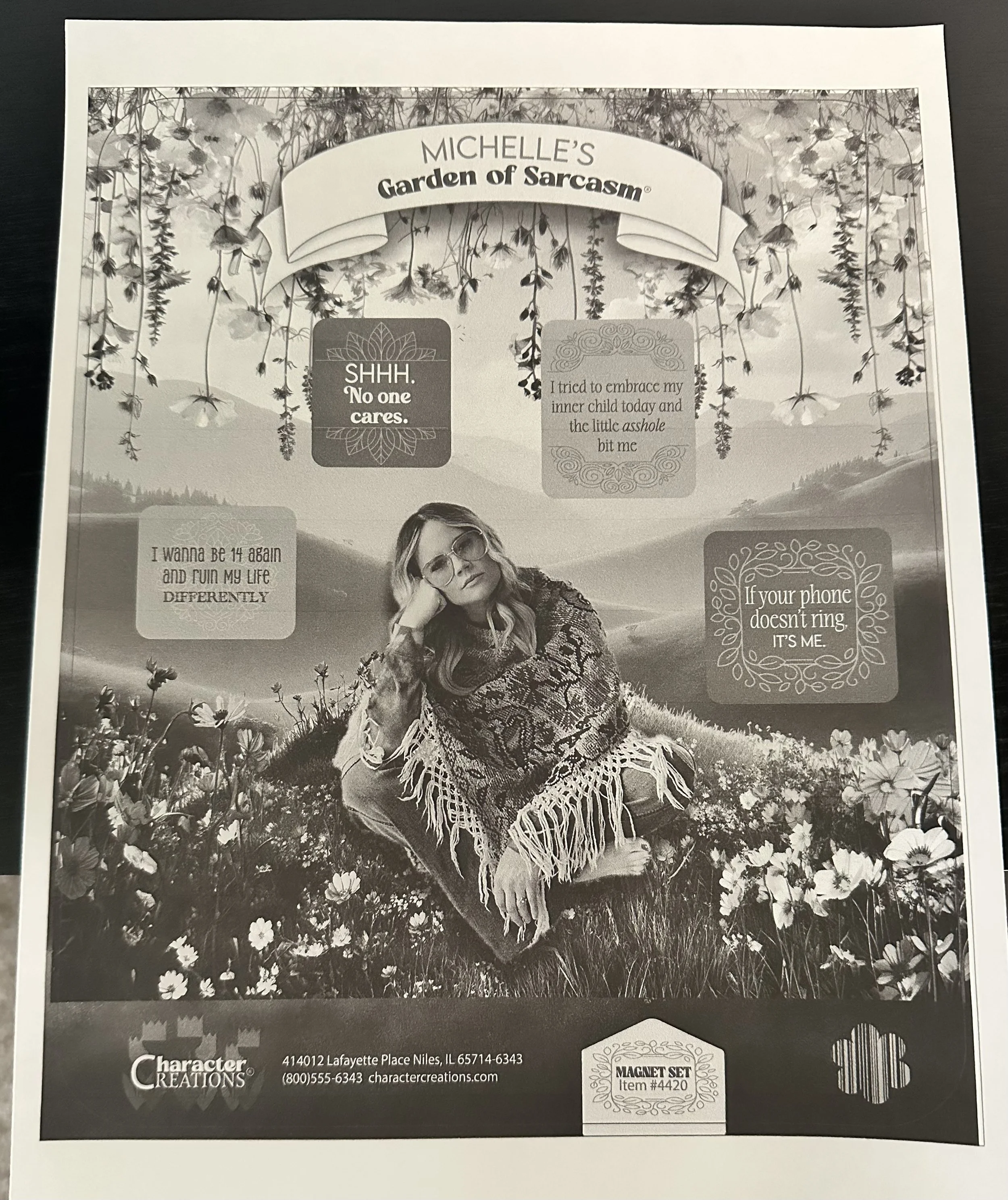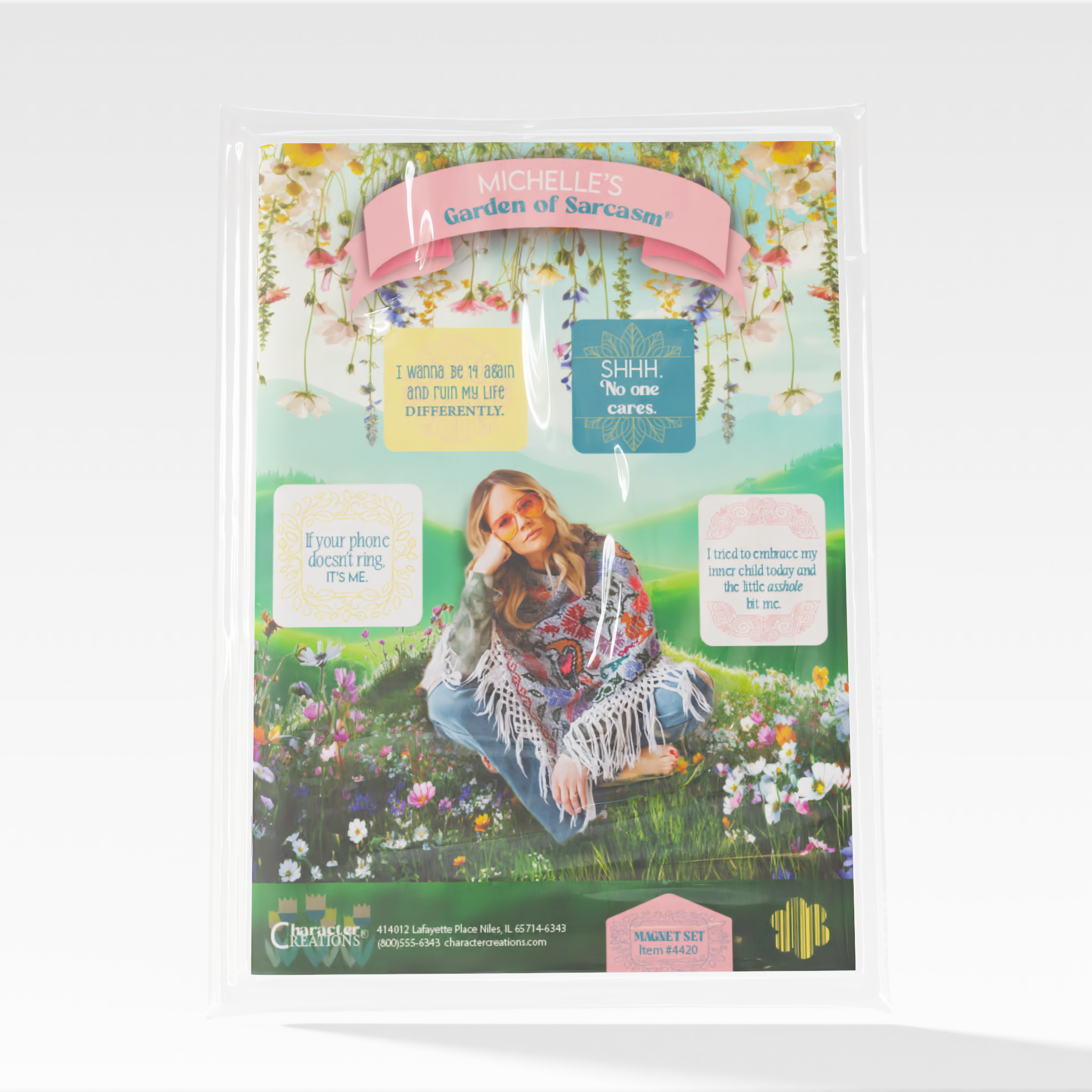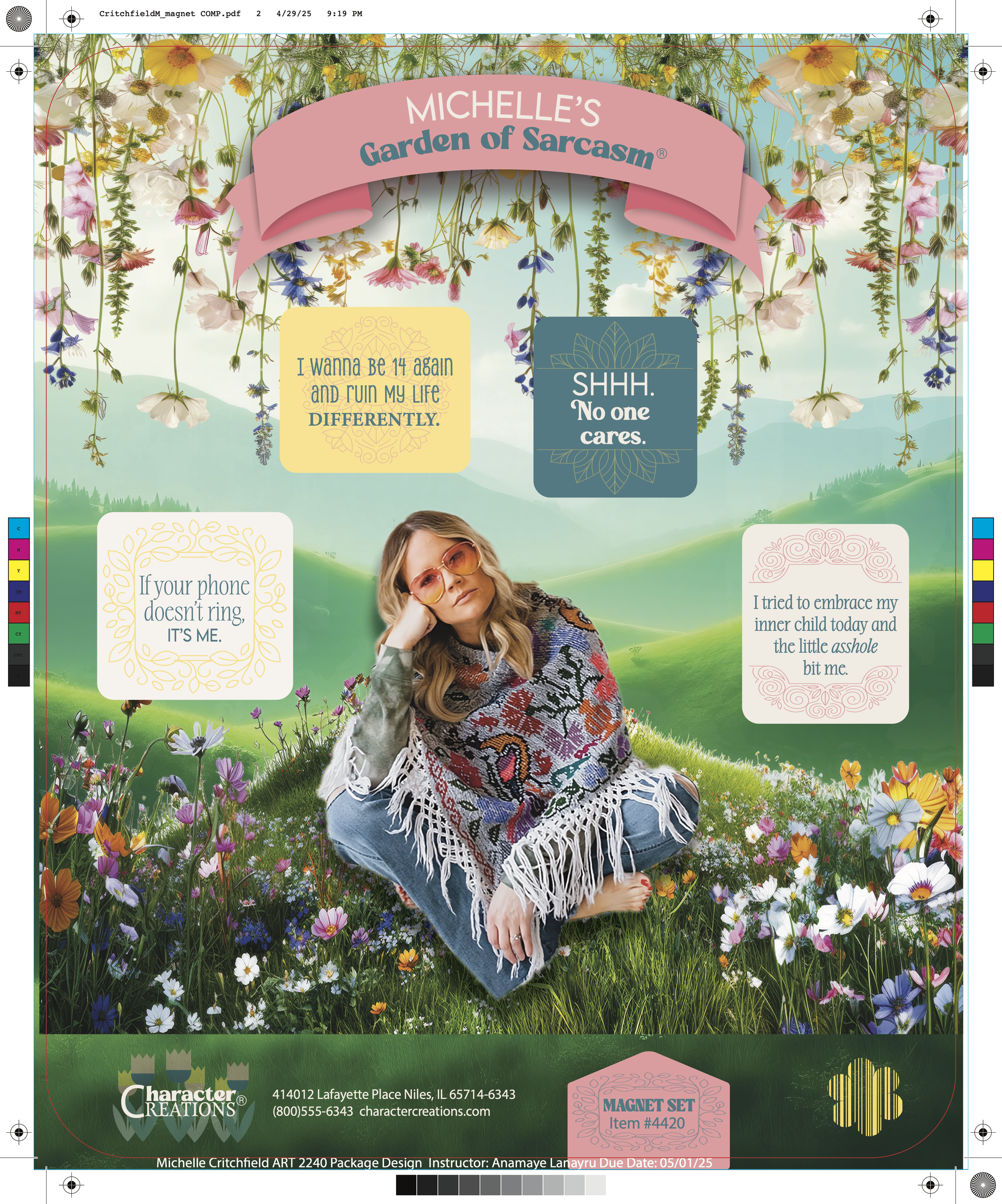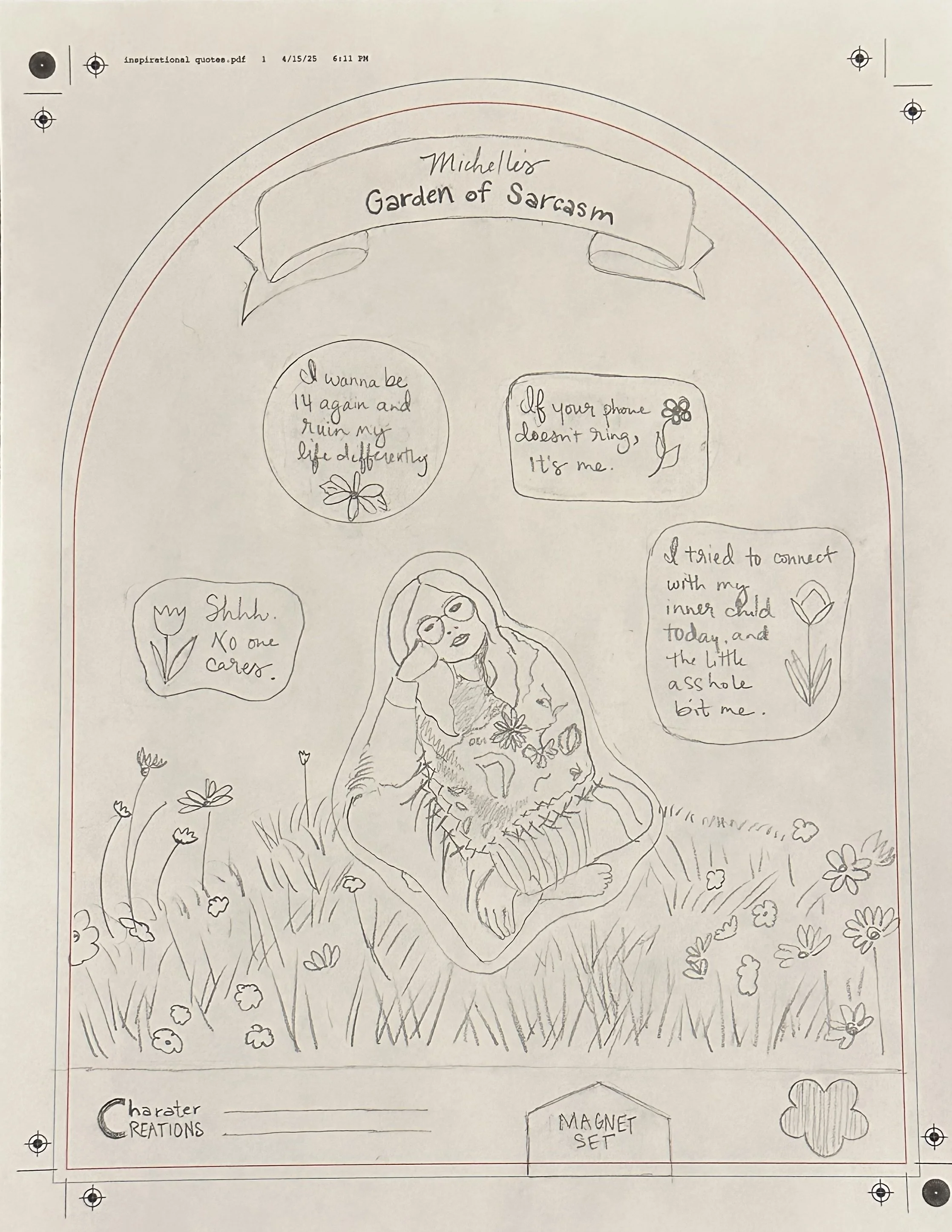 This design involved creating a magnet set for Character Creations. The magnet set includes 5 magnets that combine utility with aesthetic appeal. Each magnet showcases a sassy quotation and they are housed on a fun, eye-catching garden background.